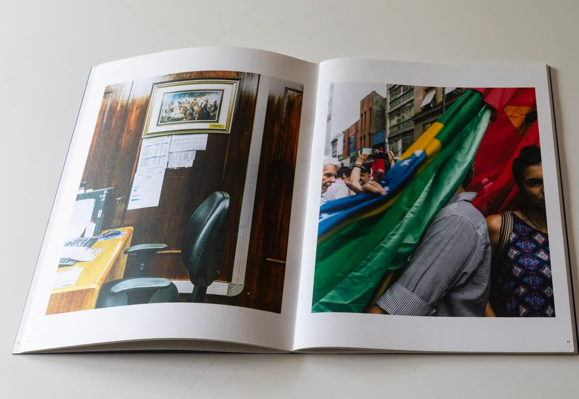 Bandeiras do Brasil aparecem bastante, ora contrastando com estandartes vermelhos, ora na fachada de um imóvel antigo e chique ou na padronagem da toalha de um restaurante espartano – o verde-e-amarelo que foi sequestrado pelo novo integralismo. Na mesa de uma portaria, junto ao interfone, uma Bíblia repousa aberta, as páginas todas sublinhadas – um índice, já naquele momento, de como a parcela evangélica da sociedade ia se tornando incontornável.