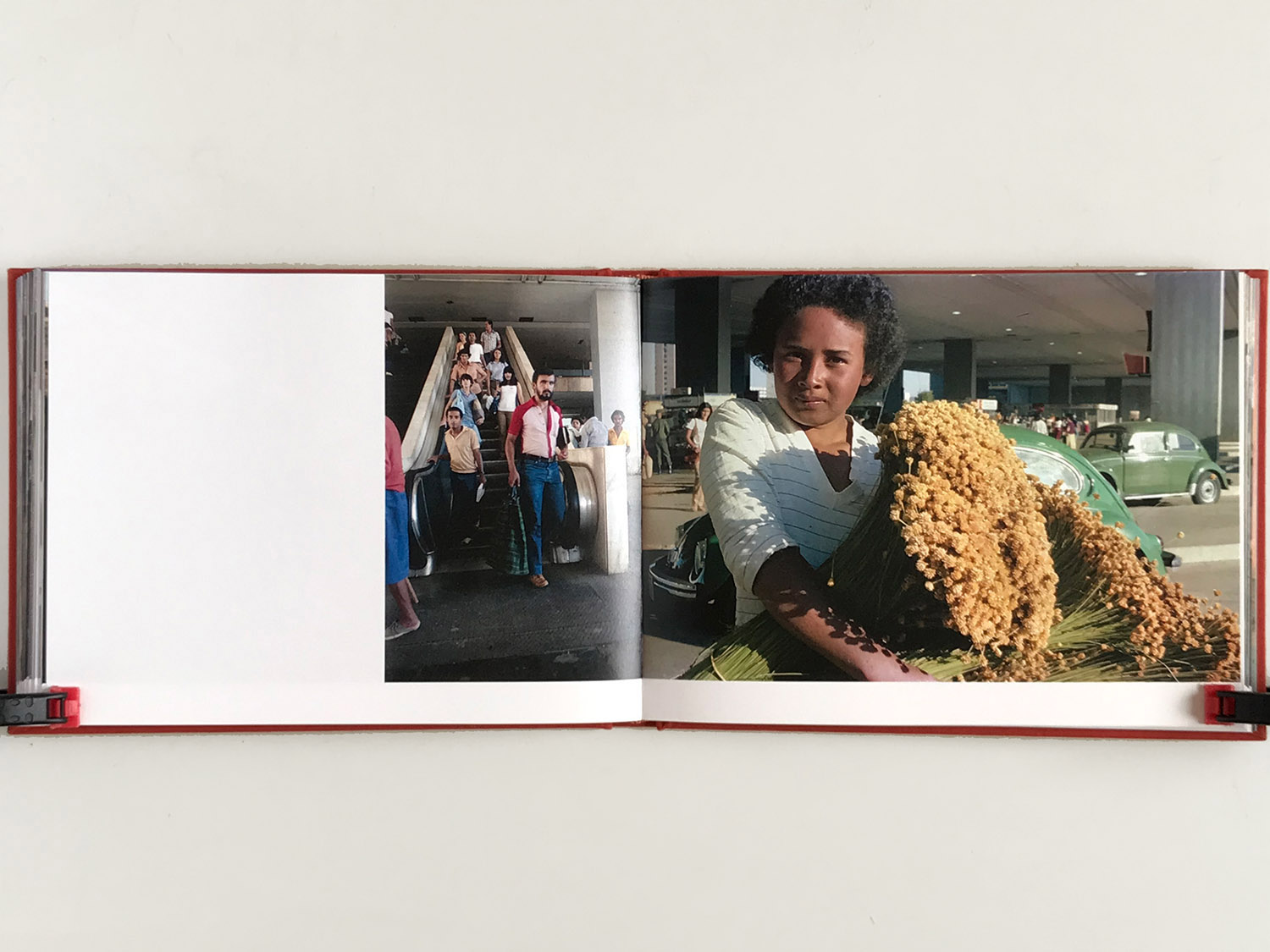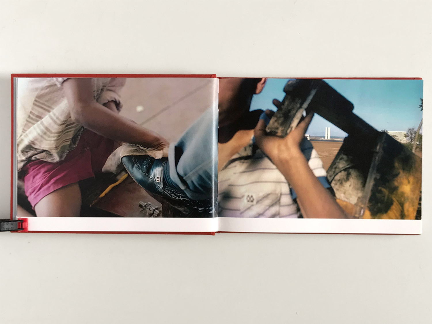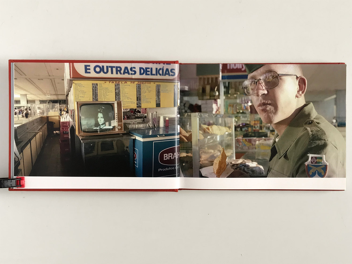 Quase podemos sentir a sequidão na garganta e a terra vermelha do entorno nas solas dos sapatos. Um grupo de homens faz fila num balcão, assistindo ao futebol na tevê; no banheiro, fecham suas braguilhas, em duas fotos divertidas que devem ter sido tiradas às escondidas. Lá pelo meio da sequência, num autorretrato, vemos a sombra do fotógrafo na calçada e, mais adiante, a (rara, aqui) visão da Esplanada dos Ministérios, emoldurada pelo vão da plataforma. Os militares surgem como presença discreta e ainda assim ameaçadora, como um cachorro encurralado a rosnar e mostrar os dentes – situação que condiz com o momento do regime militar que Elio Gaspari chamou de “a ditadura acabada”.