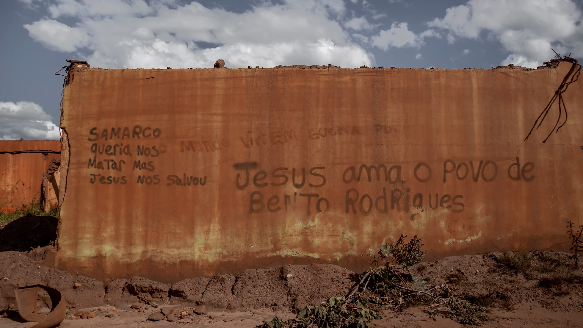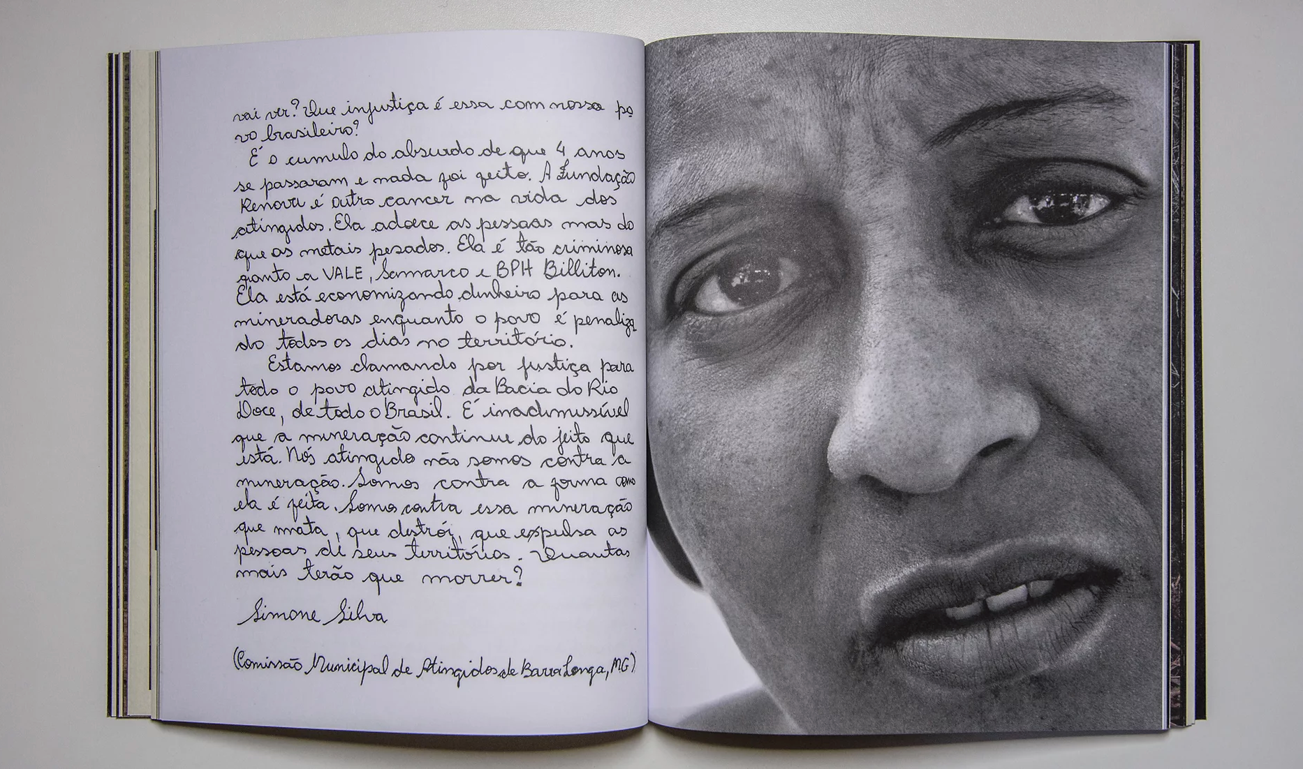 Penso que o esforço documental do projeto de Isis Medeiros vai no mesmo sentido: é como se ela velasse o rio, e nos pusesse a seu lado para que o fizéssemos também. Em suas fotografias, vemos como a lama tomou conta da paisagem, invadiu e destruiu casas e escolas, deixou marcas nas paredes e árvores que ficaram de pé, e continua a sujar os pés dos sobreviventes que transitam pelas áreas ainda habitadas ou que precisam voltar a locais agora abandonados. Um cachorro que bebe da água contaminada e uma inscrição num muro enlameado – “Samarco queria nos matar, mas Jesus nos salvou” – parecem condensar de algum modo o Brasil atual. No meio do livro, há uma interrupção em preto e branco na qual Medeiros inclui retratos de pessoas atingidas, para depois retornar ao trajeto da lama, aos cartazes de protesto, aos buracos na mata e nas construções.